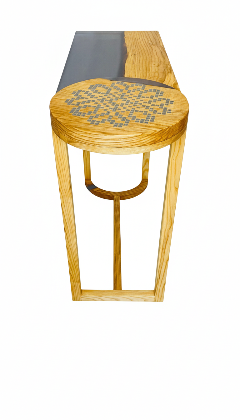 Introducing the Ash Slab & Epoxy Console Table, a stunning fusion of natural wood, modern epoxy, and fine mosaic artistry. The rich tones of solid Ash wood are paired with a sleek pearl gray epoxy, creating a striking interplay of organic and contemporary design. A hand-laid vitreous glass mosaic flower on the key tray pedestal adds a refined artistic accent.
