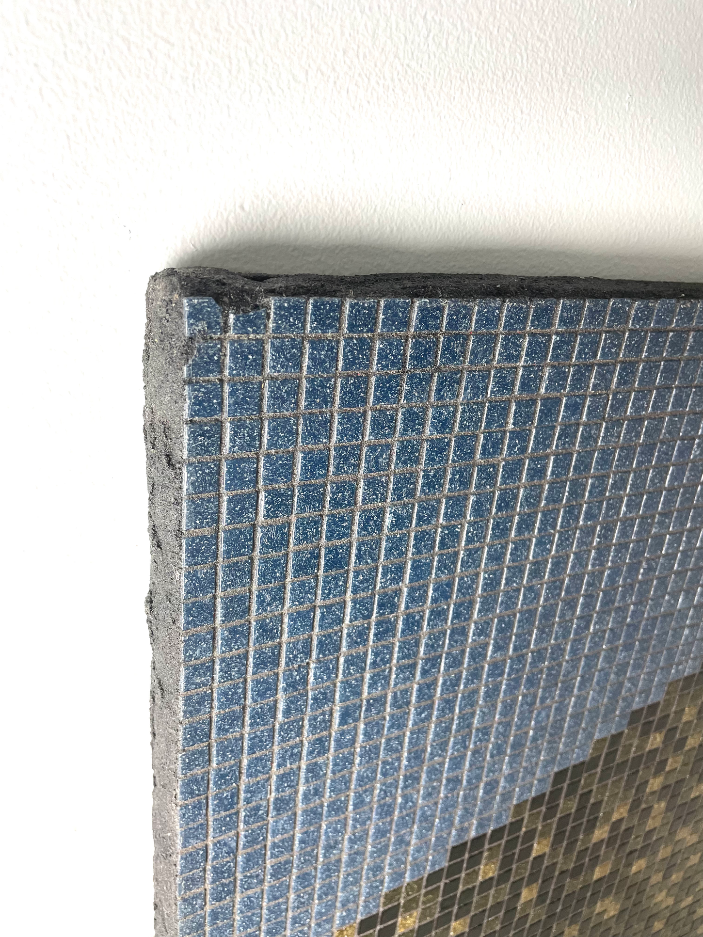 Introducing “Secret Agent”, a stylized vitreous mosaic masterpiece that captures the intrigue and mystique of a classic espionage figure. Created from 12,210 meticulously hand-laid tiles, the composition employs a restrained palette of dark greys, muted tones, and subtle highlights of white and beige. The figure’s pose, hand near the face, evokes timeless cinematic imagery while leaving room for interpretation — secrecy, tension, or quiet reflection.
